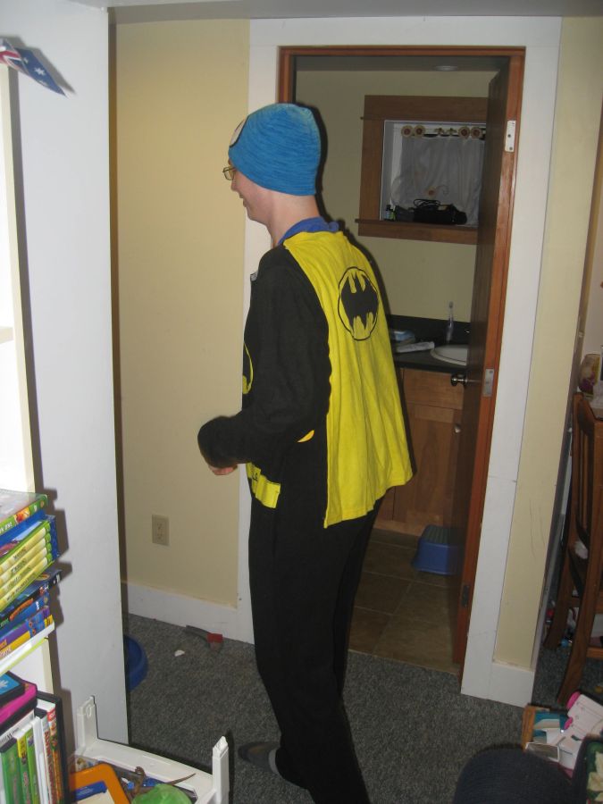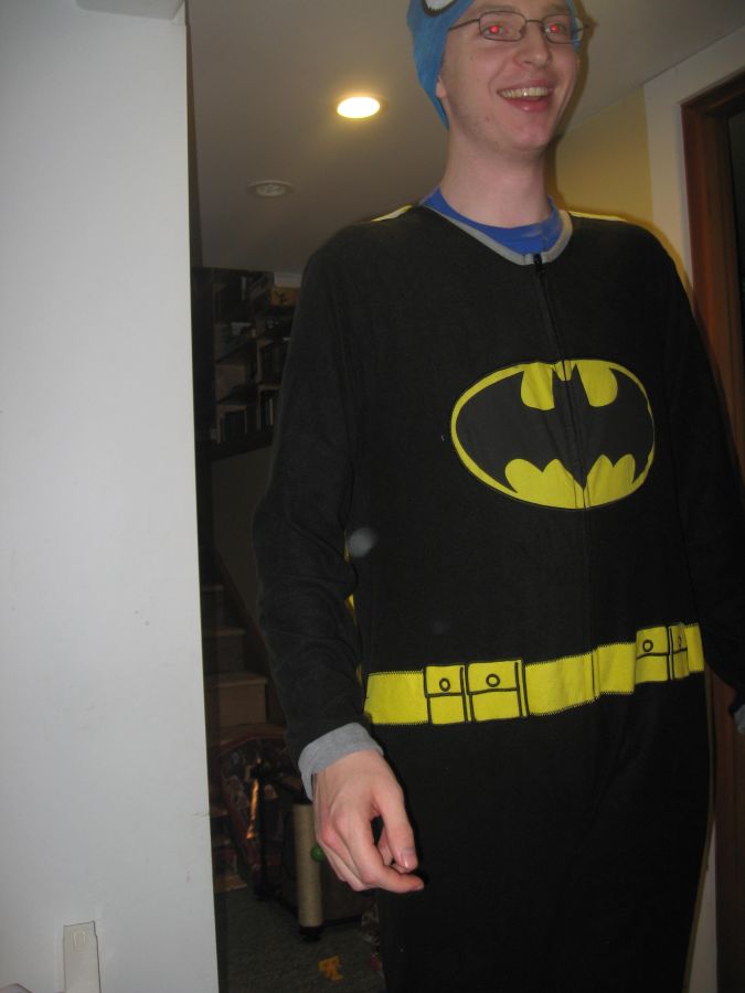We end with Kyle, modeling his Christmas present, full-body Batman pajamas. And yes, that is a cape.