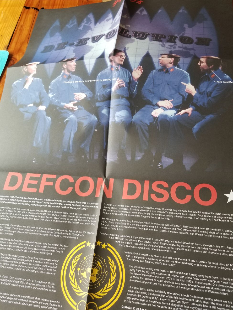 Seriously though, Total Devo is well worth getting for fans of the band and while some may be only interested the band’s “hits” this is a great set of songs. I picked up the vinyl version, which doesn’t have all the songs on disc as on the 2 disc CD version, but does come with a code for the MP3 download of everything. Why would I get the vinyl version over the CD? Even though it cost more, there are a couple of inclusions which made getting the larger format worth it. A couple of photo postcards are nice, but the vinyl itself is great. Then there is the double-sided poster itself, which just can’t be done justice with the CD format’s size. Interestingly there are no lyrics included, which is a shame.